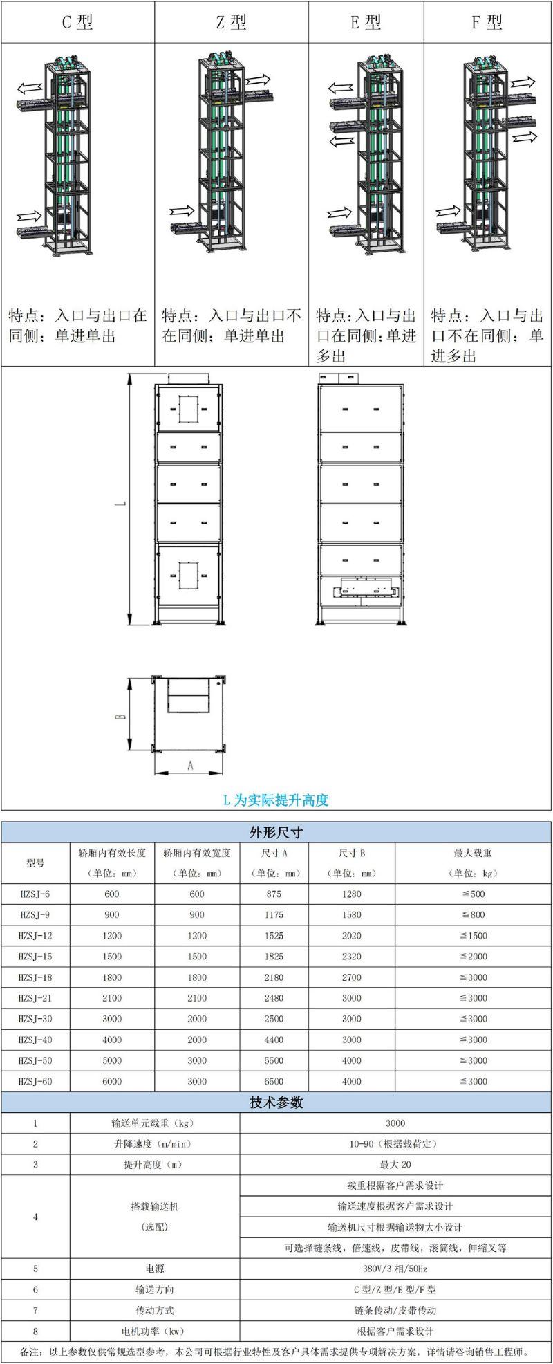 該設備結構合理、運行平穩、高速靜音、安全可靠,承載量可達3噸,提升高度可達20米,安裝維護方便實用,是替代貨物電梯理想的貨物輸送設備。標準化的橋箱接口可方便選擇各種包裝箱、托盤、卡板等靈活多樣的工件形式。該設備配置多種防墜、互鎖等安全裝置,從而保證人身貨物安全,可廣泛應用于汽車、食品、煙草、郵政、化工、輕工、機械、電子、食品、倉儲物流等自動化生產行業。